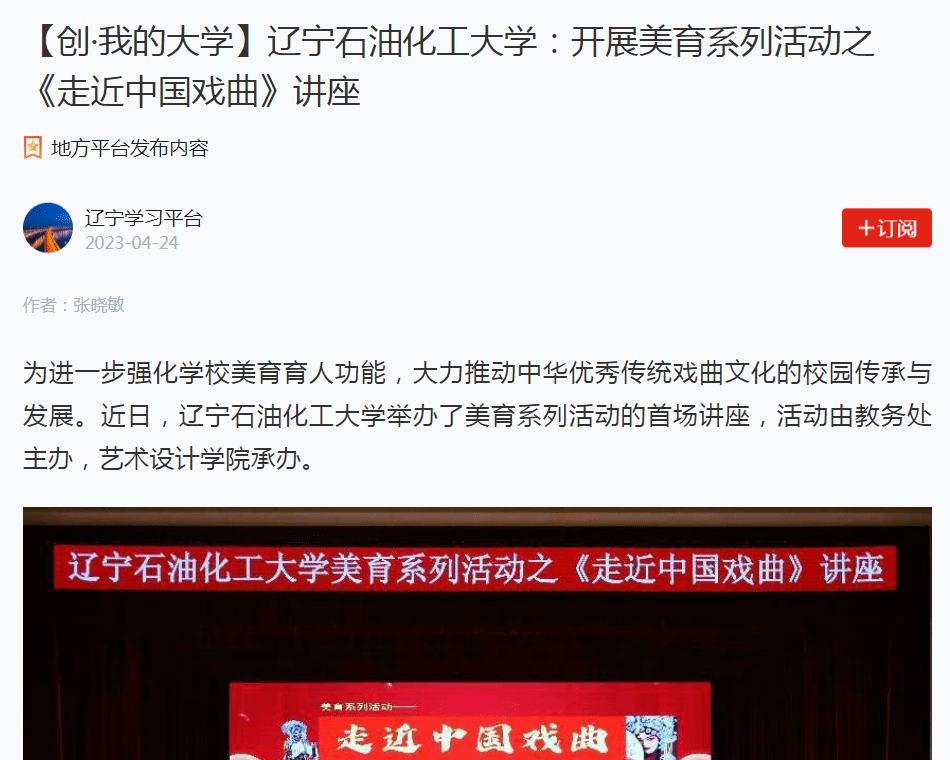 编者按:近日,学习强国辽宁学习平台、辽宁日报·北国号、人民日报客户端·人民号等媒体平台对我校为进一步强化学校美育育人功能,大力推动中华优秀传统戏曲文化的校园传承与发展,举办了美育系列活动的首场讲座进行了宣传报道。现将相关报道转载如下: