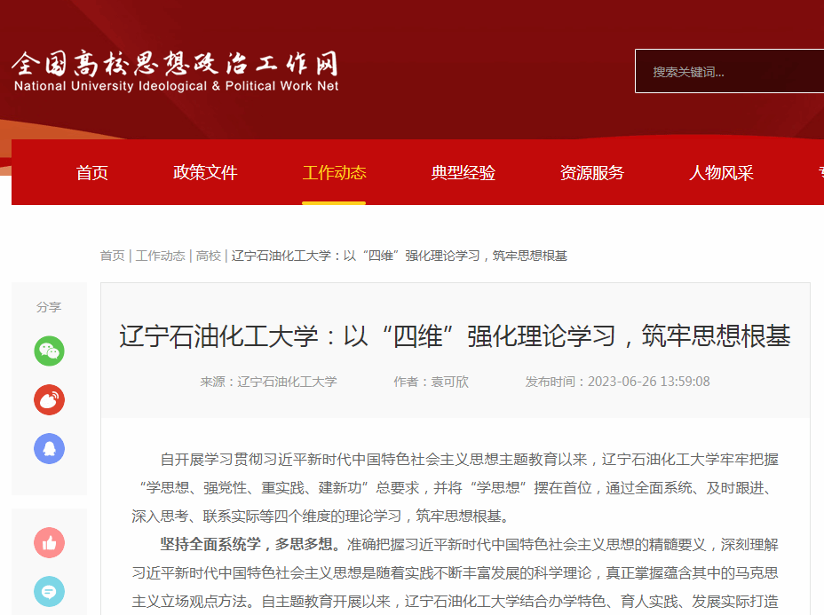 编者按:近日,全国高校思想政治工作网、辽宁日报·北国号对自学习贯彻习近平新时代中国特色社会主义思想主题教育开展以来,我校牢牢把握“学思想、强党性、重实践、建新功”总要求,并将“学思想”摆在首位,通过全面系统、及时跟进、深入思考、联系实际等四个维度的理论学习,筑牢思想根基进行了宣传报道。现将相关报道转载如下: