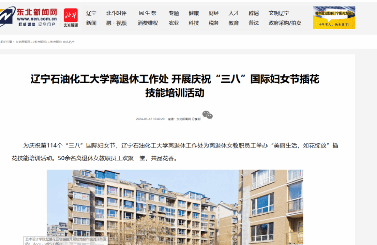 编者按:3月12日,东北新闻网、辽宁省委老干部局微信公众号、人民日报客户端·人民号、辽宁日报·辽望号、中国大学生网对我校离退休工作处开展庆祝“三八”国际妇女节插花技能培训活动进行了报道。现将相关报道转载如下: