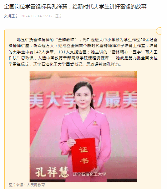 编者按:她是讲授雷锋精神的“金牌教师”,先后走进大中小学校为学生作过20余场雷锋精神讲座,听众超万人;她成立全国首个新时代雷锋精神种子培育工作室,培育的大学生中有142人参军、131人支援边疆;她主讲的“雷锋精神‘五字’育人工作法”思政课,入选中国教育干部网络学院课程资源库……她就是第九批全国岗位学雷锋标兵孔祥慧。近日,人民网、人民日报客户端辽宁频道、辽宁日报、辽宁卫视、辽宁省教育厅微信公众号、文明辽宁微信公众号等媒体平台以《孔祥慧:在青少年心中播撒雷锋精神的种子》为题,对我校团委书记、辅导员教师孔祥慧的先进事迹进行了宣传报道。现将相关报道转载如下: