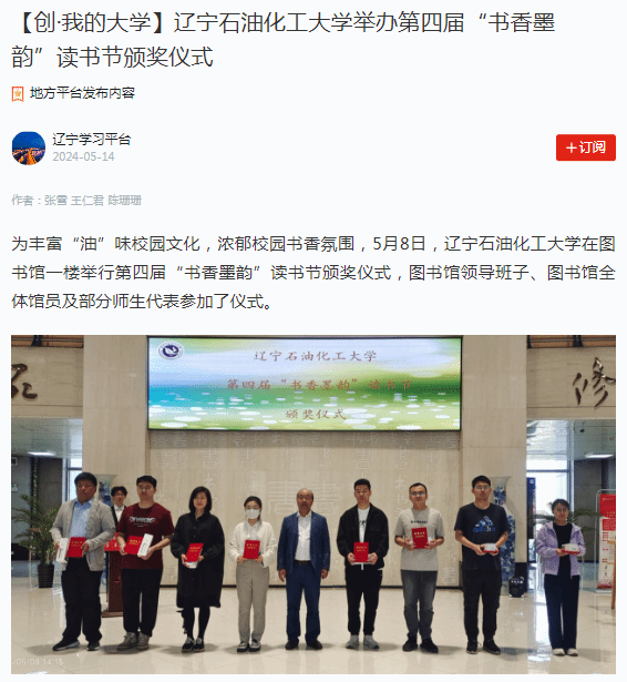 编者按:为丰富“油”味校园文化,浓郁校园书香氛围,5月8日,学校在图书馆一楼举行第四届“书香墨韵”读书节颁奖仪式。近日,学习强国、辽宁日报·辽望号、人民日报客户端·人民号、中国大学生网、搜狐号、网易号等媒体平台对此进行了宣传报道。现将相关报道转载如下: