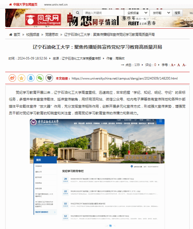 编者按:近日,中国大学生网、辽宁日报·辽望号对我校高度重视、迅速响应,牢牢把握“学纪、知纪、明纪、守纪”的目标任务,多措并举丰富宣传载体、延伸宣传触角,用好用活网站、微信公众号、校内电子屏等自有宣传阵地和各种外部媒体平台载体宣传“放大器”作用,充分发挥宣传矩阵作用,创新开展多元化宣传方式,形成强大宣传声势,增强党员干部对党纪学习教育的知晓度和关注度,提高党纪学习教育宣传的传播力和影响力进行了宣传报道。现将相关报道转载如下: