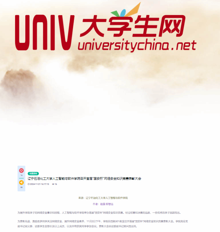 编者按:人工智能与软件学院为提升学院学子的网络安全意识和技能,特举办首届“国安杯”网络安全知识竞赛,适应时代之需,服务国家建设。中国大学生网对此进行了宣传报道。现将相关报道转载如下: