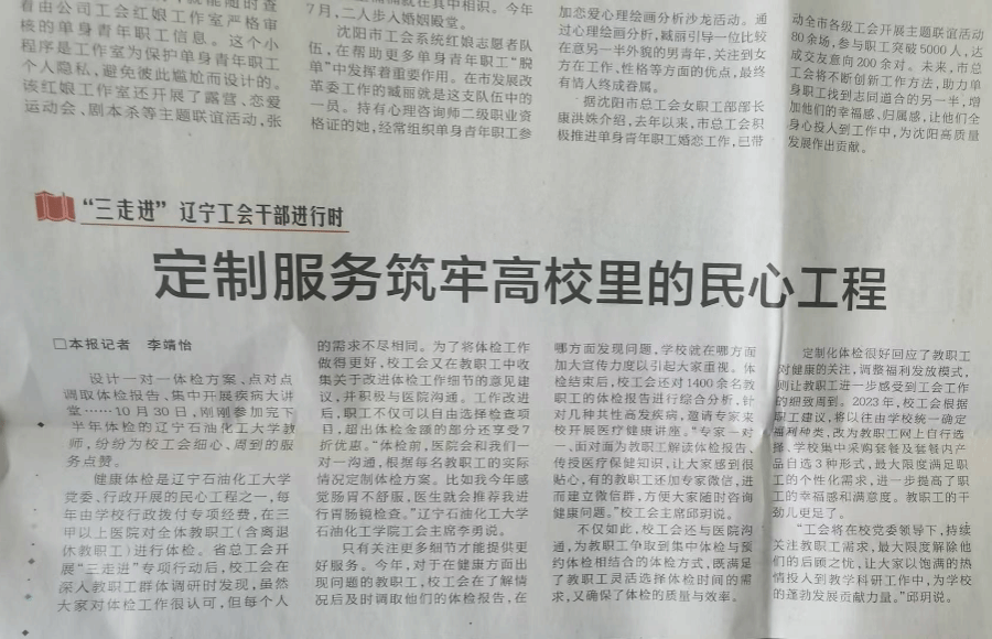 编者按:11月8日,《辽宁工人报》在第二版“‘三走进’辽宁工会干部进行时版块”刊登了题为《定制服务筑牢高校里的民心工程》的文章,对我校工会在落实双代会报告和围绕学校党政中心工作为师生谋幸福,用创新健康体检和福利发放新形式,用民生实事加码师生幸福生活,进行了报道。现将相关报道转载如下: