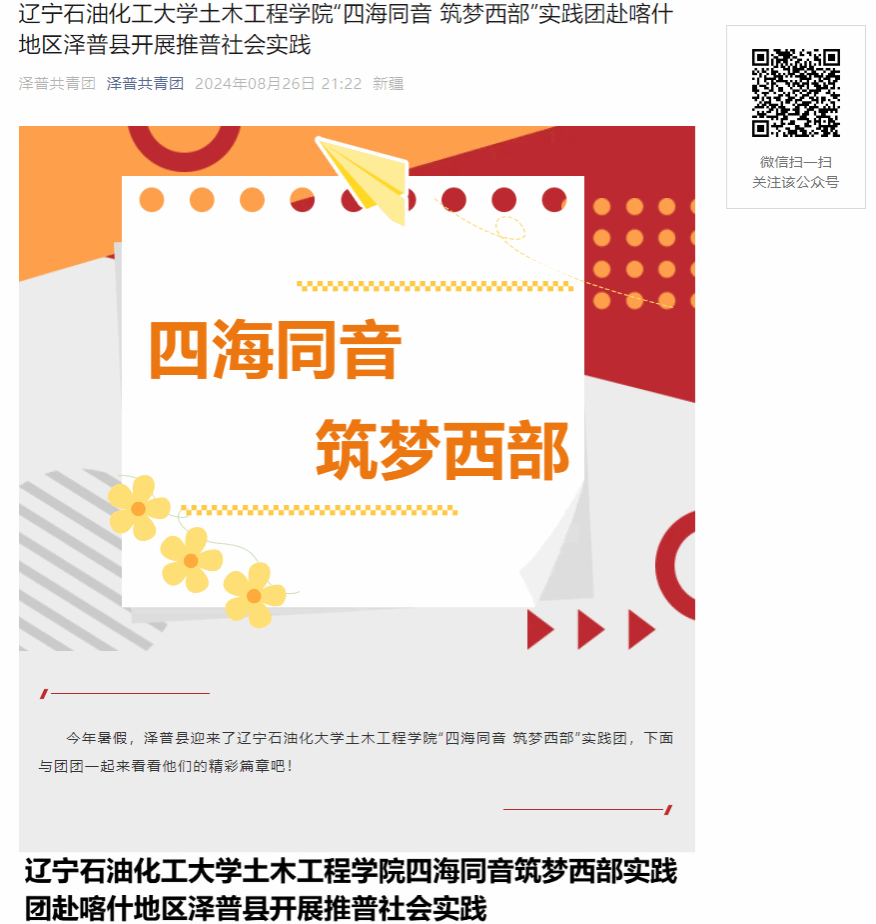 编者按:土木工程学院“四海同音 筑梦西部”实践团赴喀什地区泽普县开展推普社会实践。泽普共青团微信公众号、中教网、大学生云报、推普助力乡村振兴微信公众平台、人民网•人民号对此进行了宣传报道。现将相关报道转载如下:
