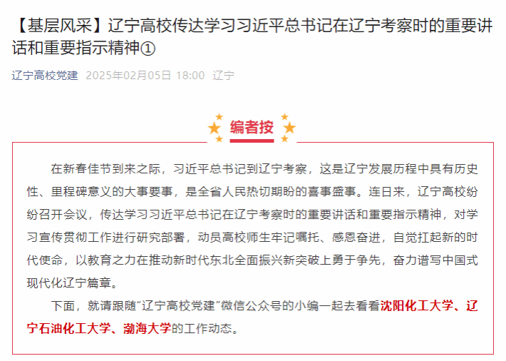 辽宁高校党建微信公众号:【基层风采】辽宁高校传达学习习近平总书记在辽宁考察时的重要讲话和重要指示精神①