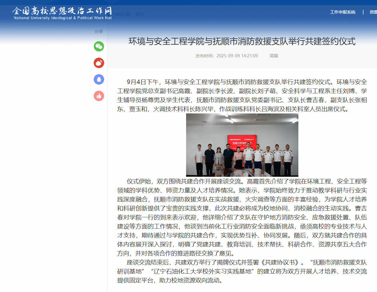 编者按:9月4日下午,环境与安全工程学院与抚顺市消防救援支队举行共建签约仪式。全国高校思想政治工作网对此进行了宣传报道。现将相关报道转载如下: